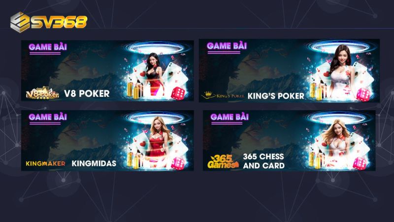 Không chỉ đơn thuần là một nhà cái, SV368 còn hợp tác với nhiều nhà cung cấp game bài uy tín hàng đầu thế giới để mang đến hội viên các siêu phẩm chất lượng cao. Bao gồm: